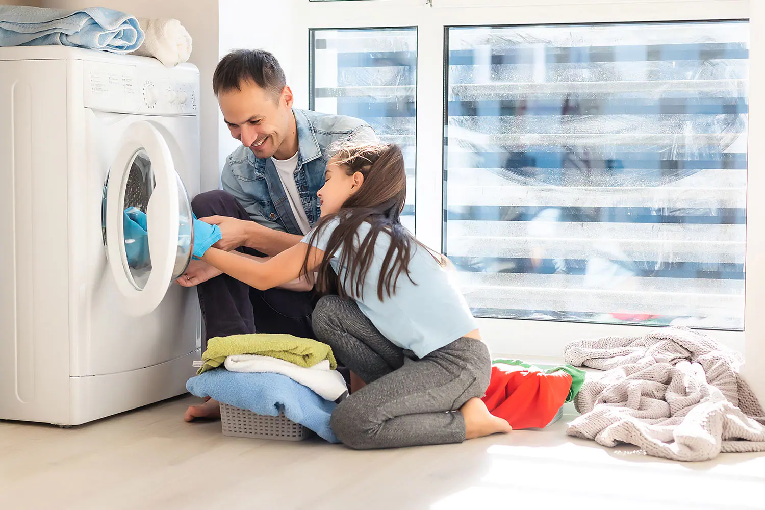 father daughter doing laundry