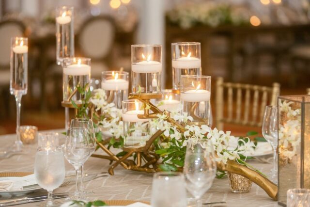 Layering adds movement and reflection, especially when placed against mirrors or glass surfaces. Even daytime receptions benefit from low candlelight under covered tents or indoor venues.