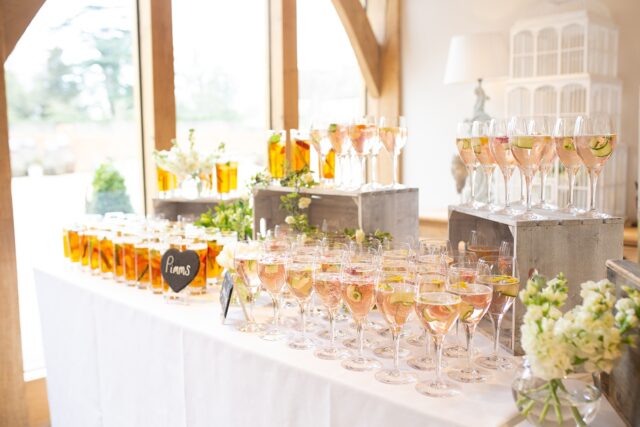 These setups become part of the decor. Cheese and charcuterie displays stretch across wooden boards with flowers and herbs woven between. Dessert tables include custom labels and tiered displays. Signature drink stations feature glass dispensers with fresh fruit or herbs suspended in the liquid.