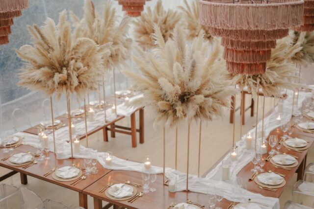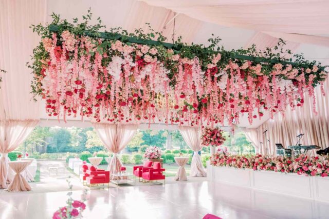 Besides their visual impact, hanging installations free up table space and allow for cleaner guest movement. They also frame key zones like the sweetheart table or head table in an elegant way.